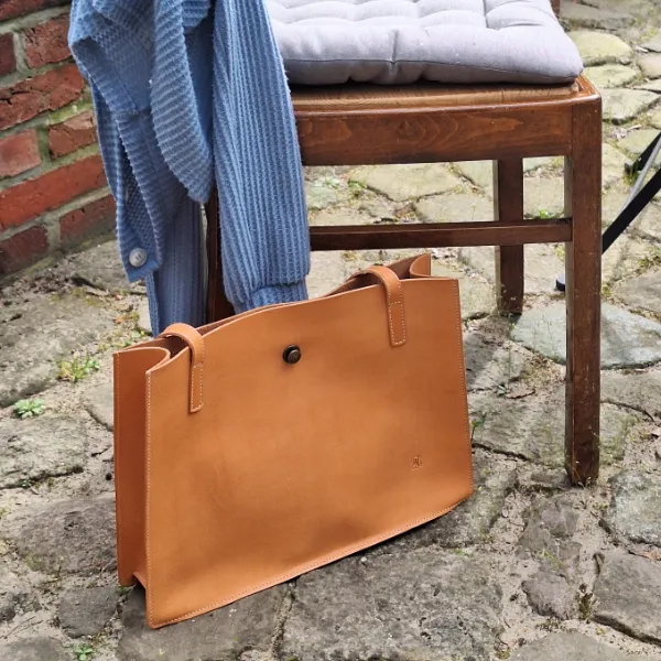 Geräumiger, handgefertigter Shopper aus naturbelassenem, pflanzlich gegerbtem Rindleder. Mit Innentasche und sicherem Verschluss – erhältlich in Natur, Cognac und Schwarz.